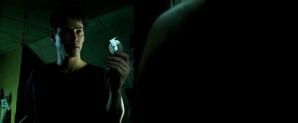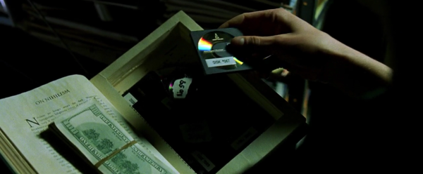 Gotcha: VR proof of racist police brutality… captured on disc! (See how actually compact it is in the hand?) And in the Wachowski’s The Matrix (1999), MiniDiscs return as contraband, this time stashed heavy-handedly inside Neo’s copy of Jean Baudrillard’s Simulation and Simulacra. By this time they’d become almost retro-futuristic, somehow at home with the acoustic coupler modems and Bakelite handsets.